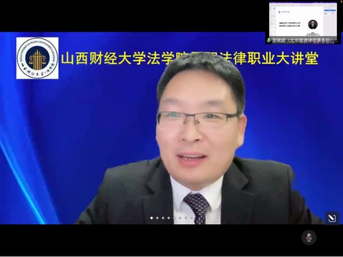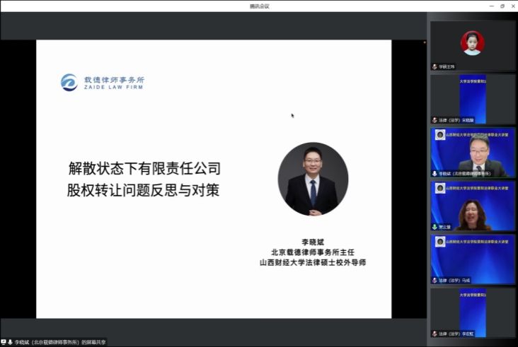 10月28日晚七点,免费麻将游戏下载 如期在线上举办的“晋阳法律职业大讲堂”第七讲。本期讲座的主题是“解散状态下有限责任公司股权转让问题反思与对策”,由北京载德律师事务所主任李晓斌主讲,免费麻将游戏下载 樊云慧院长主持,麻将游戏下载 100余名师生参与了本次讲座。