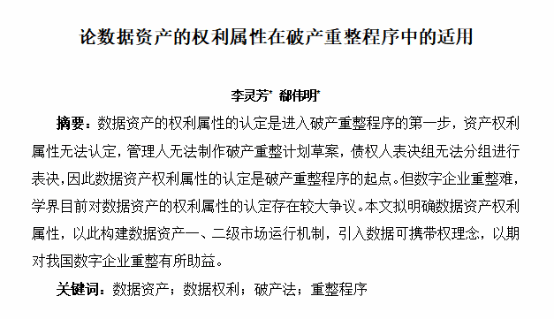 我校麻将游戏下载 22级法律(非法学)硕士研究生李灵芳积极投稿《论数据资产的权利属性在破产重整程序中的适用》并由中国商业法研究会2023年年会论文集全集收录。文章重点阐述了数据资产的财产属性、人身属性对数字企业进入破产重整程序后的影响以及学界目前对数据资产权利属性认定存在的较大争议,文章拟明确数据资产权利属性,提出基础构建数据资产一、二级市场运行机制,引入数据可携带权理念,以期通过对法学理论在实践中的应用研究,对我国数字企业重整有所助益。