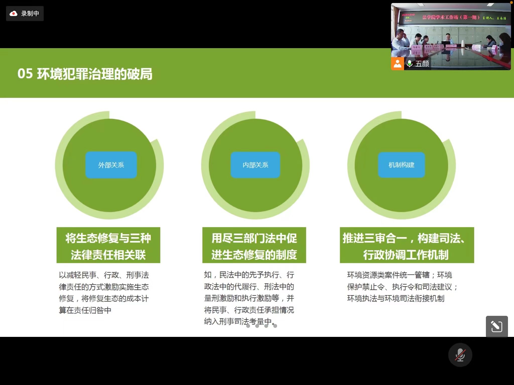 随后,王永浩老师就发言主题从选题来源、实务现状、研究现状、主要观点和环境犯罪治理的破局五个角度阐释了当前在环境犯罪生态修复领域的前沿问题,着重强调了在环境犯罪治理过程中,应当打破环境侵权法、环境行政法和环境刑法三个部门法各自为战的局面,并基于整体环保主义的立场将实现环境修复与保护机能作为整体环保法的优先价值,如在三个部门法责任承担体系中引入生态修复激励机制以促进环境犯罪行为人积极修复生态环境,推进环境资源类案件统一管辖的三审合一模式等。