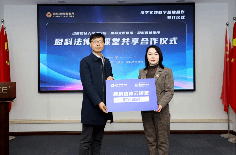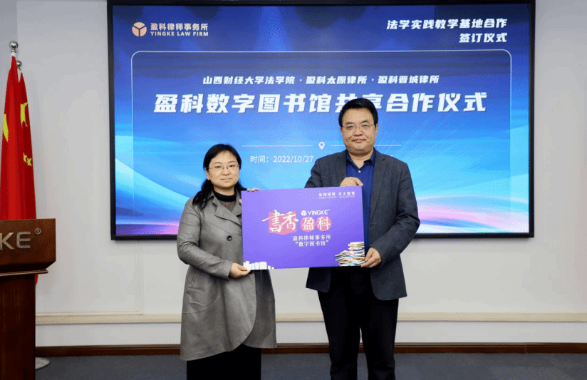 盈科太原律所张金才书记、梁晓燕主任向免费麻将游戏下载 任中秀副院长、陈云朝副院长颁授启用盈科数字图书馆、盈科法律云课堂共享牌匾。