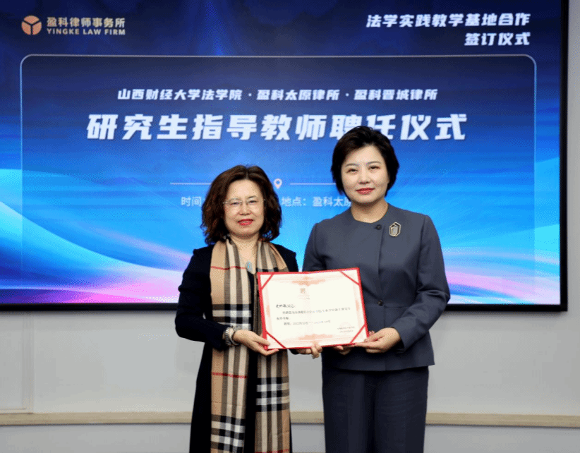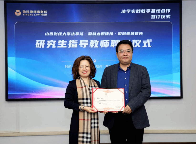 揭牌仪式后,樊云慧院长为盈科太原律所张金才书记、史竹敏主任及盈科晋城律所常建瑜主任颁发麻将游戏下载 专业学位硕士研究生校外导师聘任证书。