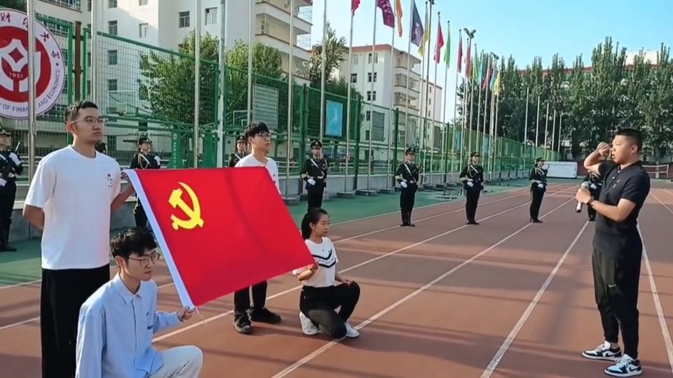 之后全体党员重温入党誓词。在宣誓仪式上,全体党员面向鲜艳的党旗,列队整齐,举起右手,在党旗下庄严宣誓“我志愿加入中国共产党……”,师生们高亢而洪亮的声音在校园久久回荡。