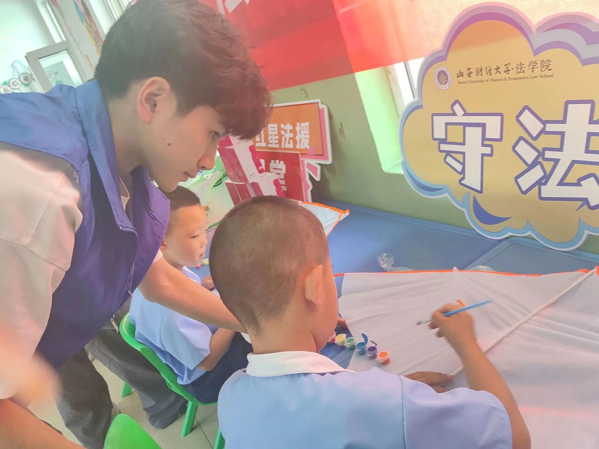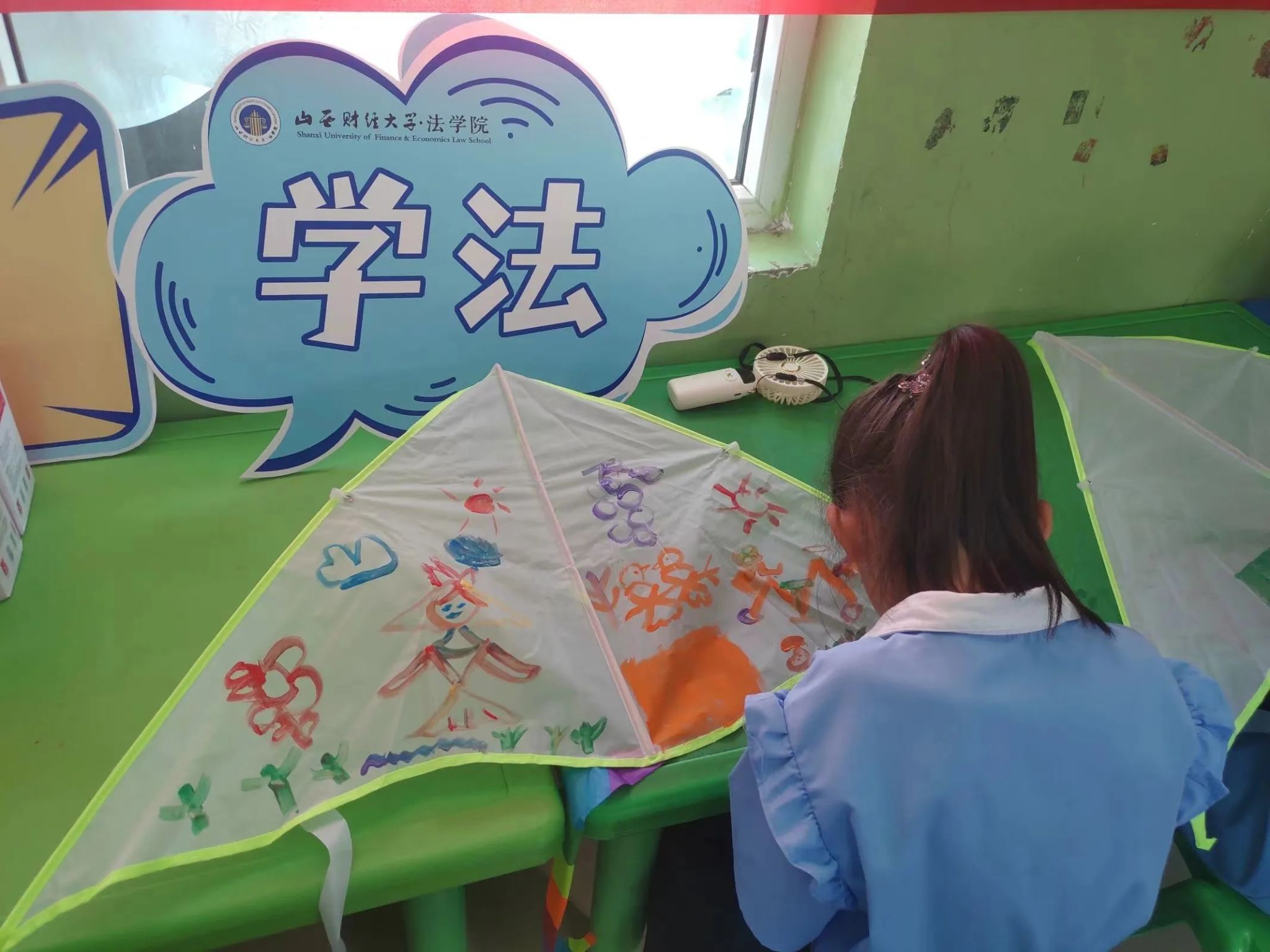 实践队员们用通俗易懂的语言向小朋友们讲解了身边的法律知识,加深大家对法治的理解,同时发放相关的法律宣传画册,不少小朋友第一时间捧起画册津津有味地看了起来。随后在实践队员们的指导下,根据所学的知识并结合画册的内容,发挥自己的想象力,用五彩的画笔把争当普法小公民的决心精心描绘在一只只风筝上,在微风的伴随下,一幅幅法治梦想图竞相在蓝天里翱翔。