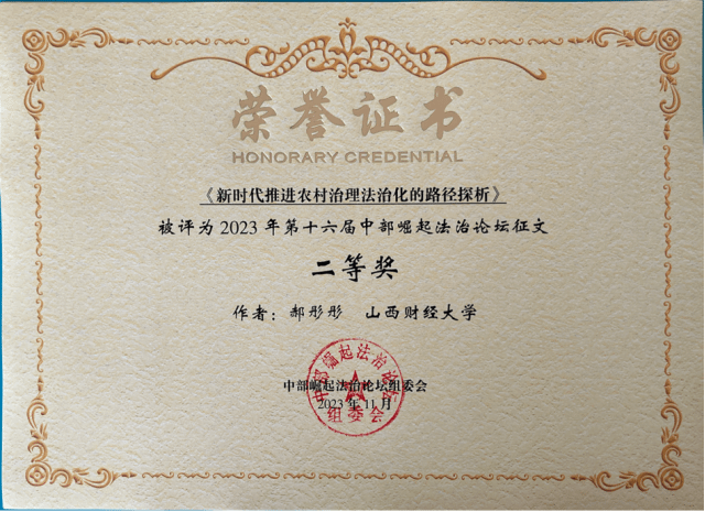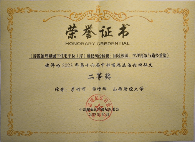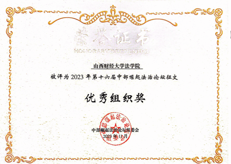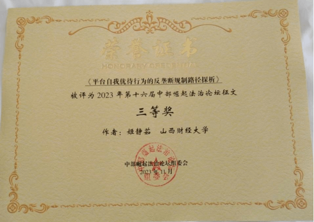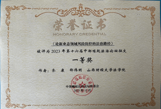 在论坛的征文活动中,麻将游戏下载 2022级法学硕士齐康与其导师郗伟明教授合作撰写的论文《论新业态领域风险防控的法治路径》荣获一等奖,2022级法学硕士李竹可、樊增辉合作完成的论文《诉源治理视域下住宅车位(库)确权纠纷检视:困境根源、学理再叙和路径重塑》和2022级法学硕士郝彤彤的论文《新时代推进农村治理法治化的路径探析》荣获二等奖,2022级法律(非法学)硕士姬静茹的论文《平台自我优待行为的反垄断规制路径探析》荣获三等奖。2022级博士研究生靳彤彤、2023级法学硕士研究生高玮荣、2022级法律硕士(非法学)研究生获优秀奖。麻将游戏下载 获第十六届中部崛起法治论坛征文“优秀组织奖”。