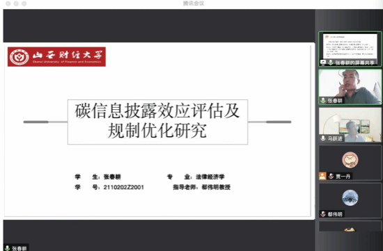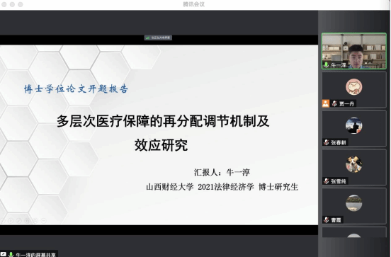 在答辩委员会主席郗伟明教授宣布答辩的流程和具体的规则后,答辩秘书对答辩人的学习、科研情况进行简要介绍。参加本次开题答辩会的三位博士研究生有张春耕、张雪纯、牛一淳,他们分别围绕《碳信息披露效应评估及规制优化研究》、《异质性环境规制工具的减污降碳效应研究》、《多层次医疗保障的再分配调节机制及效应研究》论文题目,从选题、研究方法、研究意义、创新点等方面进行汇报。表示将接受各位专家提出的宝贵意见和建议,继续修改完善开题报告。