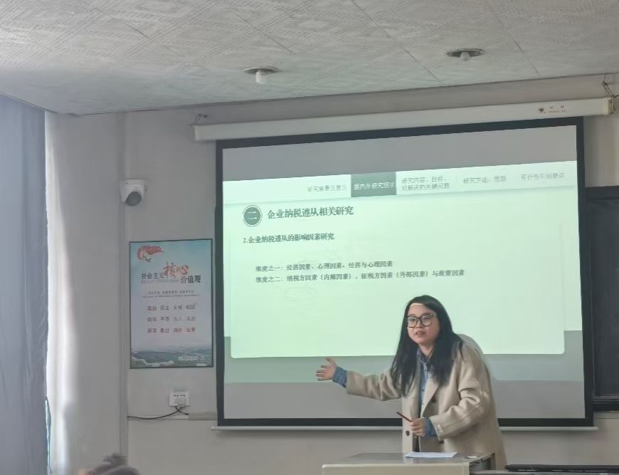2022级法律经济学博士研究生贾一丹以《税收征管改革对企业纳税遵从的影响研究》为题进行了报告发言。她从选题背景与意义、国内外研究现状、研究内容目标和拟解决的关键问题、研究方法思路、可行性分析与创新点五个方面展开报告,从税收征管改革、企业纳税遵从等核心概念切入,并在实践检视、特征事实与测度分析等方面论证的基础上,落脚到税收征管的法律法规体系及其配套设施建设的完善,提出以数字化税收征管改革等进路推动纳税遵从的政策建议。
