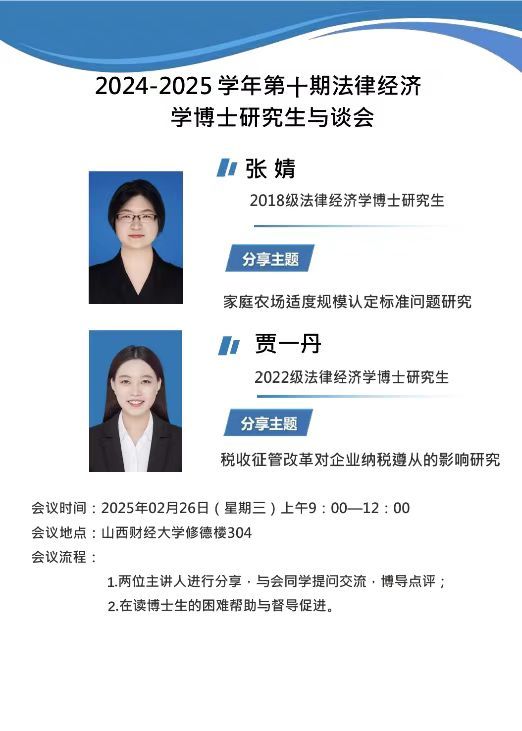 2025年2月26日上午,第十期法律经济学博士研究生与谈会于山西财经大学修德楼304举行,参加会议的有郗伟明教授、孙淑云教授以及法律经济学各年级博士研究生,会议由郗伟明教授主持。